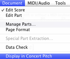 - Finally, uncheck Document > Display in Concert Pitch so the score is displaying transposed again.
