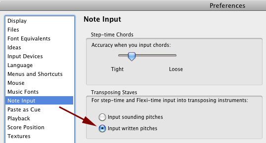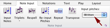 Click the Note Input Tab. Select Written from the popup menu for Input pitches: